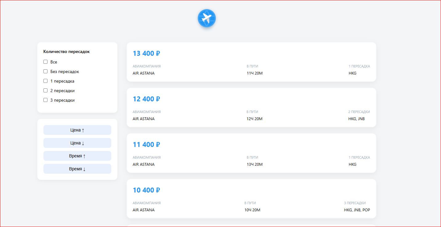 React-приложение для отображения и фильтрации авиабилетов. В нём реализована сортировка по цене и времени в пути, фильтрация по количеству пересадок и динамическое обновление списка билетов в зависимости от выбранных параметров. Проект демонстрирует работу с React Hooks, управление состоянием, обработку массивов данных и построение интерфейса на основе логики фильтрации и сортировки.